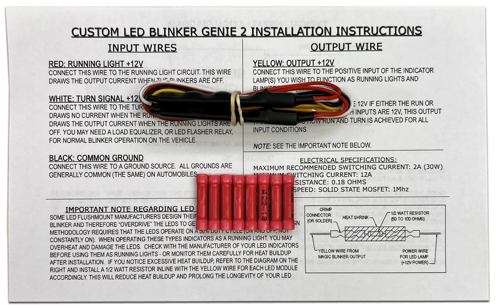 Le Blinker Genie 2 a des câbles de 7", tous les connecteurs électriques requis et des instructions d'installation détaillées.